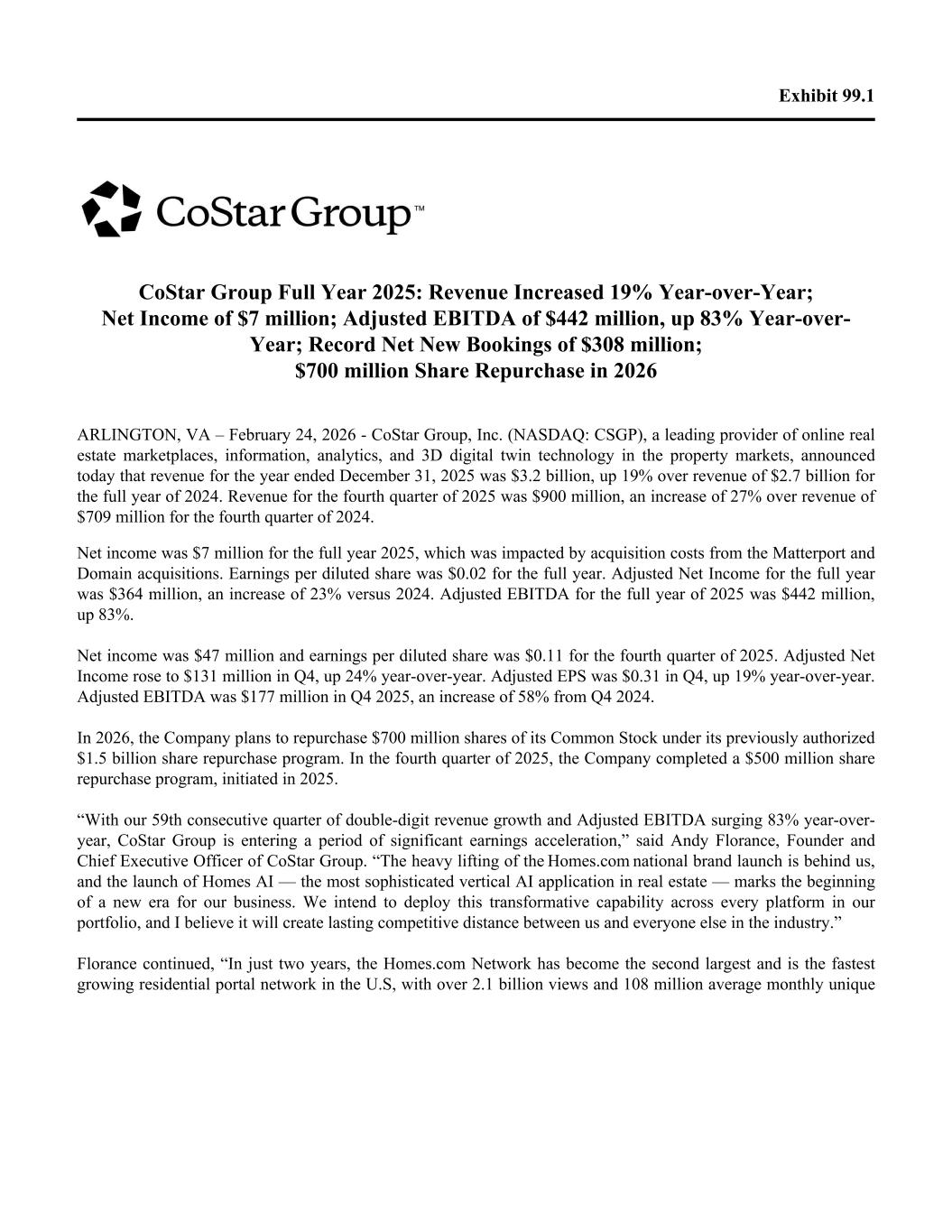 Exhibit 99.1 CoStar Group Full Year 2025: Revenue Increased 19% Year-over-Year; Net Income of $7 million; Adjusted EBITDA of $442 million, up 83% Year-over- Year; Record Net New Bookings of $308 million; $700 million Share Repurchase in 2026 ARLINGTON, VA – February 24, 2026 - CoStar Group, Inc. (NASDAQ: CSGP), a leading provider of online real estate marketplaces, information, analytics, and 3D digital twin technology in the property markets, announced today that revenue for the year ended December 31, 2025 was $3.2 billion, up 19% over revenue of $2.7 billion for the full year of 2024. Revenue for the fourth quarter of 2025 was $900 million, an increase of 27% over revenue of $709 million for the fourth quarter of 2024. Net income was $7 million for the full year 2025, which was impacted by acquisition costs from the Matterport and Domain acquisitions. Earnings per diluted share was $0.02 for the full year. Adjusted Net Income for the full year was $364 million, an increase of 23% versus 2024. Adjusted EBITDA for the full year of 2025 was $442 million, up 83%. Net income was $47 million and earnings per diluted share was $0.11 for the fourth quarter of 2025. Adjusted Net Income rose to $131 million in Q4, up 24% year-over-year. Adjusted EPS was $0.31 in Q4, up 19% year-over-year. Adjusted EBITDA was $177 million in Q4 2025, an increase of 58% from Q4 2024. In 2026, the Company plans to repurchase $700 million shares of its Common Stock under its previously authorized $1.5 billion share repurchase program. In the fourth quarter of 2025, the Company completed a $500 million share repurchase program, initiated in 2025. “With our 59th consecutive quarter of double-digit revenue growth and Adjusted EBITDA surging 83% year-over- year, CoStar Group is entering a period of significant earnings acceleration,” said Andy Florance, Founder and Chief Executive Officer of CoStar Group. “The heavy lifting of the Homes.com national brand launch is behind us, and the launch of Homes AI — the most sophisticated vertical AI application in real estate — marks the beginning of a new era for our business. We intend to deploy this transformative capability across every platform in our portfolio, and I believe it will create lasting competitive distance between us and everyone else in the industry.” Florance continued, “In just two years, the Homes.com Network has become the second largest and is the fastest growing residential portal network in the U.S, with over 2.1 billion views and 108 million average monthly unique