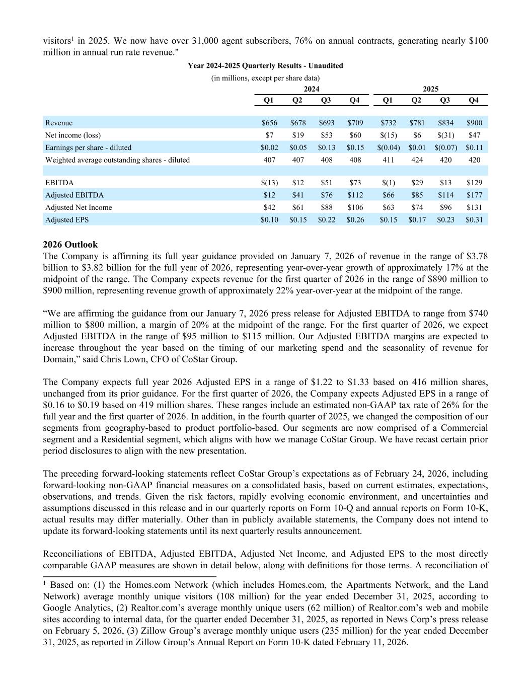 visitors1 in 2025. We now have over 31,000 agent subscribers, 76% on annual contracts, generating nearly $100 million in annual run rate revenue." Year 2024-2025 Quarterly Results - Unaudited (in millions, except per share data) 2024 2025 Q1 Q2 Q3 Q4 Q1 Q2 Q3 Q4 Revenue $656 $678 $693 $709 $732 $781 $834 $900 Net income (loss) $7 $19 $53 $60 $(15) $6 $(31) $47 Earnings per share - diluted $0.02 $0.05 $0.13 $0.15 $(0.04) $0.01 $(0.07) $0.11 Weighted average outstanding shares - diluted 407 407 408 408 411 424 420 420 EBITDA $(13) $12 $51 $73 $(1) $29 $13 $129 Adjusted EBITDA $12 $41 $76 $112 $66 $85 $114 $177 Adjusted Net Income $42 $61 $88 $106 $63 $74 $96 $131 Adjusted EPS $0.10 $0.15 $0.22 $0.26 $0.15 $0.17 $0.23 $0.31 2026 Outlook The Company is affirming its full year guidance provided on January 7, 2026 of revenue in the range of $3.78 billion to $3.82 billion for the full year of 2026, representing year-over-year growth of approximately 17% at the midpoint of the range. The Company expects revenue for the first quarter of 2026 in the range of $890 million to $900 million, representing revenue growth of approximately 22% year-over-year at the midpoint of the range. “We are affirming the guidance from our January 7, 2026 press release for Adjusted EBITDA to range from $740 million to $800 million, a margin of 20% at the midpoint of the range. For the first quarter of 2026, we expect Adjusted EBITDA in the range of $95 million to $115 million. Our Adjusted EBITDA margins are expected to increase throughout the year based on the timing of our marketing spend and the seasonality of revenue for Domain,” said Chris Lown, CFO of CoStar Group. The Company expects full year 2026 Adjusted EPS in a range of $1.22 to $1.33 based on 416 million shares, unchanged from its prior guidance. For the first quarter of 2026, the Company expects Adjusted EPS in a range of $0.16 to $0.19 based on 419 million shares. These ranges include an estimated non-GAAP tax rate of 26% for the full year and the first quarter of 2026. In addition, in the fourth quarter of 2025, we changed the composition of our segments from geography-based to product portfolio-based. Our segments are now comprised of a Commercial segment and a Residential segment, which aligns with how we manage CoStar Group. We have recast certain prior period disclosures to align with the new presentation. The preceding forward-looking statements reflect CoStar Group’s expectations as of February 24, 2026, including forward-looking non-GAAP financial measures on a consolidated basis, based on current estimates, expectations, observations, and trends. Given the risk factors, rapidly evolving economic environment, and uncertainties and assumptions discussed in this release and in our quarterly reports on Form 10-Q and annual reports on Form 10-K, actual results may differ materially. Other than in publicly available statements, the Company does not intend to update its forward-looking statements until its next quarterly results announcement. Reconciliations of EBITDA, Adjusted EBITDA, Adjusted Net Income, and Adjusted EPS to the most directly comparable GAAP measures are shown in detail below, along with definitions for those terms. A reconciliation of 1 Based on: (1) the Homes.com Network (which includes Homes.com, the Apartments Network, and the Land Network) average monthly unique visitors (108 million) for the year ended December 31, 2025, according to Google Analytics, (2) Realtor.com’s average monthly unique users (62 million) of Realtor.com’s web and mobile sites according to internal data, for the quarter ended December 31, 2025, as reported in News Corp’s press release on February 5, 2026, (3) Zillow Group’s average monthly unique users (235 million) for the year ended December 31, 2025, as reported in Zillow Group’s Annual Report on Form 10-K dated February 11, 2026.