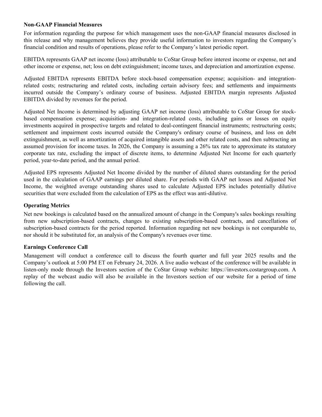 Non-GAAP Financial Measures For information regarding the purpose for which management uses the non-GAAP financial measures disclosed in this release and why management believes they provide useful information to investors regarding the Company’s financial condition and results of operations, please refer to the Company’s latest periodic report. EBITDA represents GAAP net income (loss) attributable to CoStar Group before interest income or expense, net and other income or expense, net; loss on debt extinguishment; income taxes, and depreciation and amortization expense. Adjusted EBITDA represents EBITDA before stock-based compensation expense; acquisition- and integration- related costs; restructuring and related costs, including certain advisory fees; and settlements and impairments incurred outside the Company’s ordinary course of business. Adjusted EBITDA margin represents Adjusted EBITDA divided by revenues for the period. Adjusted Net Income is determined by adjusting GAAP net income (loss) attributable to CoStar Group for stock- based compensation expense; acquisition- and integration-related costs, including gains or losses on equity investments acquired in prospective targets and related to deal-contingent financial instruments; restructuring costs; settlement and impairment costs incurred outside the Company's ordinary course of business, and loss on debt extinguishment, as well as amortization of acquired intangible assets and other related costs, and then subtracting an assumed provision for income taxes. In 2026, the Company is assuming a 26% tax rate to approximate its statutory corporate tax rate, excluding the impact of discrete items, to determine Adjusted Net Income for each quarterly period, year-to-date period, and the annual period. Adjusted EPS represents Adjusted Net Income divided by the number of diluted shares outstanding for the period used in the calculation of GAAP earnings per diluted share. For periods with GAAP net losses and Adjusted Net Income, the weighted average outstanding shares used to calculate Adjusted EPS includes potentially dilutive securities that were excluded from the calculation of EPS as the effect was anti-dilutive. Operating Metrics Net new bookings is calculated based on the annualized amount of change in the Company's sales bookings resulting from new subscription-based contracts, changes to existing subscription-based contracts, and cancellations of subscription-based contracts for the period reported. Information regarding net new bookings is not comparable to, nor should it be substituted for, an analysis of the Company's revenues over time. Earnings Conference Call Management will conduct a conference call to discuss the fourth quarter and full year 2025 results and the Company’s outlook at 5:00 PM ET on February 24, 2026. A live audio webcast of the conference will be available in listen-only mode through the Investors section of the CoStar Group website: https://investors.costargroup.com. A replay of the webcast audio will also be available in the Investors section of our website for a period of time following the call.