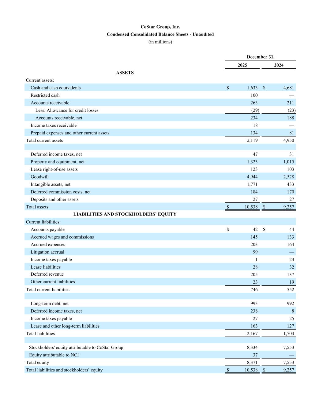 CoStar Group, Inc. Condensed Consolidated Balance Sheets - Unaudited (in millions) December 31, 2025 2024 ASSETS Current assets: Cash and cash equivalents $ 1,633 $ 4,681 Restricted cash 100 — Accounts receivable 263 211 Less: Allowance for credit losses (29) (23) Accounts receivable, net 234 188 Income taxes receivable 18 — Prepaid expenses and other current assets 134 81 Total current assets 2,119 4,950 Deferred income taxes, net 47 31 Property and equipment, net 1,323 1,015 Lease right-of-use assets 123 103 Goodwill 4,944 2,528 Intangible assets, net 1,771 433 Deferred commission costs, net 184 170 Deposits and other assets 27 27 Total assets $ 10,538 $ 9,257 LIABILITIES AND STOCKHOLDERS’ EQUITY Current liabilities: Accounts payable $ 42 $ 44 Accrued wages and commissions 145 133 Accrued expenses 203 164 Litigation accrual 99 — Income taxes payable 1 23 Lease liabilities 28 32 Deferred revenue 205 137 Other current liabilities 23 19 Total current liabilities 746 552 Long-term debt, net 993 992 Deferred income taxes, net 238 8 Income taxes payable 27 25 Lease and other long-term liabilities 163 127 Total liabilities 2,167 1,704 Stockholders' equity attributable to CoStar Group 8,334 7,553 Equity attributable to NCI 37 — Total equity 8,371 7,553 Total liabilities and stockholders’ equity $ 10,538 $ 9,257