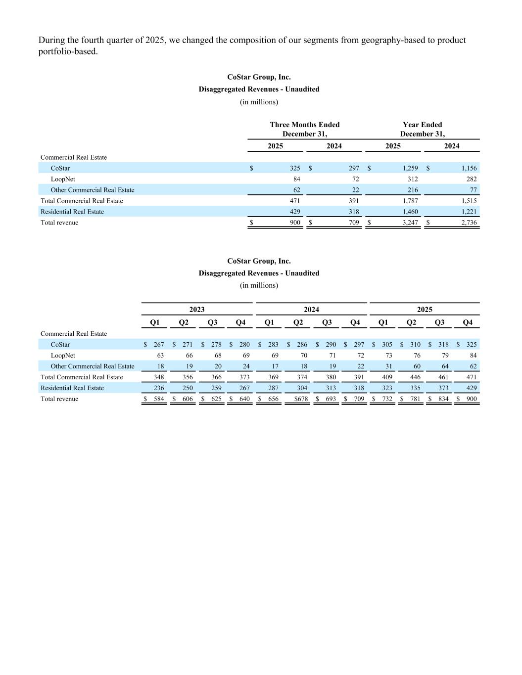 During the fourth quarter of 2025, we changed the composition of our segments from geography-based to product portfolio-based. CoStar Group, Inc. Disaggregated Revenues - Unaudited (in millions) Three Months Ended December 31, Year Ended December 31, 2025 2024 2025 2024 Commercial Real Estate CoStar $ 325 $ 297 $ 1,259 $ 1,156 LoopNet 84 72 312 282 Other Commercial Real Estate 62 22 216 77 Total Commercial Real Estate 471 391 1,787 1,515 Residential Real Estate 429 318 1,460 1,221 Total revenue $ 900 $ 709 $ 3,247 $ 2,736 CoStar Group, Inc. Disaggregated Revenues - Unaudited (in millions) 2023 2024 2025 Q1 Q2 Q3 Q4 Q1 Q2 Q3 Q4 Q1 Q2 Q3 Q4 Commercial Real Estate CoStar $ 267 $ 271 $ 278 $ 280 $ 283 $ 286 $ 290 $ 297 $ 305 $ 310 $ 318 $ 325 LoopNet 63 66 68 69 69 70 71 72 73 76 79 84 Other Commercial Real Estate 18 19 20 24 17 18 19 22 31 60 64 62 Total Commercial Real Estate 348 356 366 373 369 374 380 391 409 446 461 471 Residential Real Estate 236 250 259 267 287 304 313 318 323 335 373 429 Total revenue $ 584 $ 606 $ 625 $ 640 $ 656 $678 $ 693 $ 709 $ 732 $ 781 $ 834 $ 900