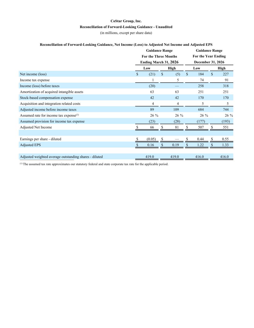 CoStar Group, Inc. Reconciliation of Forward-Looking Guidance - Unaudited (in millions, except per share data) Reconciliation of Forward-Looking Guidance, Net Income (Loss) to Adjusted Net Income and Adjusted EPS Guidance Range Guidance Range For the Three Months For the Year Ending Ending March 31, 2026 December 31, 2026 Low High Low High Net income (loss) $ (21) $ (5) $ 184 $ 227 Income tax expense 1 5 74 91 Income (loss) before taxes (20) — 258 318 Amortization of acquired intangible assets 63 63 251 251 Stock-based compensation expense 42 42 170 170 Acquisition and integration related costs 4 4 5 5 Adjusted income before income taxes 89 109 684 744 Assumed rate for income tax expense(1) 26 % 26 % 26 % 26 % Assumed provision for income tax expense (23) (28) (177) (193) Adjusted Net Income $ 66 $ 81 $ 507 $ 551 Earnings per share - diluted $ (0.05) $ — $ 0.44 $ 0.55 Adjusted EPS $ 0.16 $ 0.19 $ 1.22 $ 1.33 Adjusted weighted average outstanding shares - diluted 419.0 419.0 416.0 416.0 __________________________ (1) The assumed tax rate approximates our statutory federal and state corporate tax rate for the applicable period.