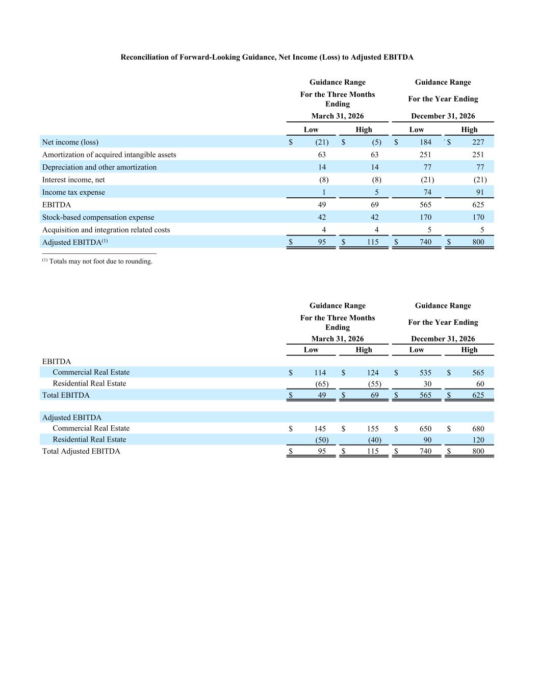 Reconciliation of Forward-Looking Guidance, Net Income (Loss) to Adjusted EBITDA Guidance Range Guidance Range For the Three Months Ending For the Year Ending March 31, 2026 December 31, 2026 Low High Low High Net income (loss) $ (21) $ (5) $ 184 2 7$ 227 Amortization of acquired intangible assets 63 63 251 251 Depreciation and other amortization 14 14 77 77 Interest income, net (8) (8) (21) (21) Income tax expense 1 5 74 91 EBITDA 49 69 565 625 Stock-based compensation expense 42 42 170 170 Acquisition and integration related costs 4 4 5 5 Adjusted EBITDA(1) $ 95 $ 115 $ 740 $ 800 __________________________ (1) Totals may not foot due to rounding. Guidance Range Guidance Range For the Three Months Ending For the Year Ending March 31, 2026 December 31, 2026 Low High Low High EBITDA Commercial Real Estate $ 114 $ 124 $ 535 $ 565 Residential Real Estate (65) (55) 30 60 Total EBITDA $ 49 $ 69 $ 565 $ 625 Adjusted EBITDA Commercial Real Estate $ 145 $ 155 $ 650 $ 680 Residential Real Estate (50) (40) 90 120 Total Adjusted EBITDA $ 95 $ 115 $ 740 $ 800