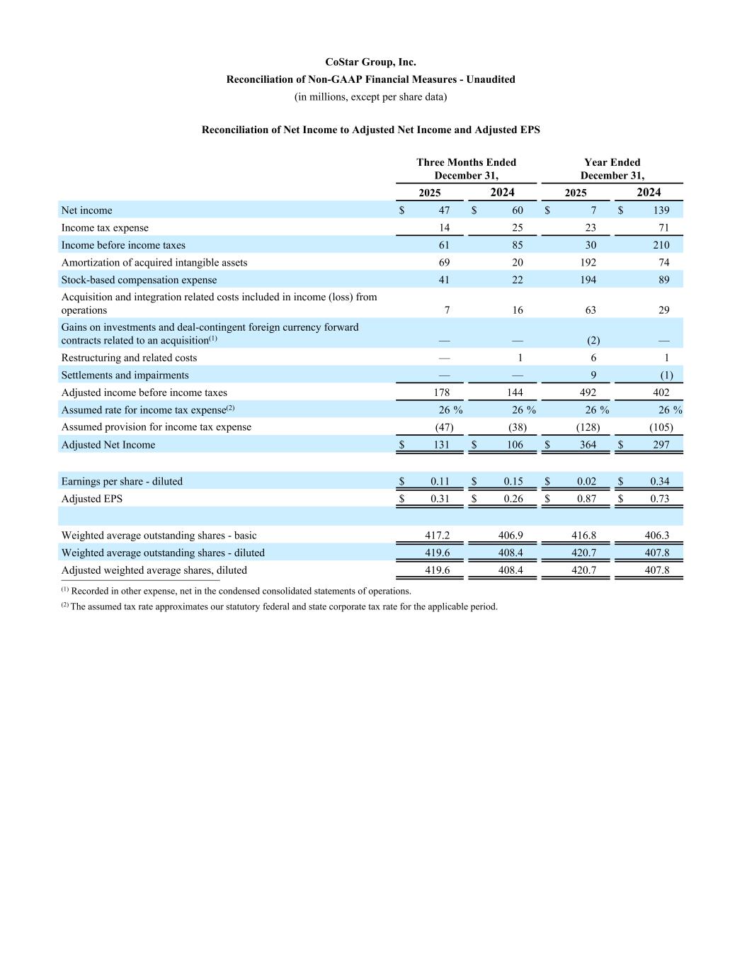 CoStar Group, Inc. Reconciliation of Non-GAAP Financial Measures - Unaudited (in millions, except per share data) Reconciliation of Net Income to Adjusted Net Income and Adjusted EPS Three Months Ended December 31, Year Ended December 31, 2025 2024 2025 2024 Net income $ 47 $ 60 $ 7 $ 139 Income tax expense 14 25 23 71 Income before income taxes 61 85 30 210 Amortization of acquired intangible assets 69 20 192 74 Stock-based compensation expense 41 22 194 89 Acquisition and integration related costs included in income (loss) from operations 7 16 63 29 Gains on investments and deal-contingent foreign currency forward contracts related to an acquisition(1) — — (2) — Restructuring and related costs — 1 6 1 Settlements and impairments — — 9 (1) Adjusted income before income taxes 178 144 492 402 Assumed rate for income tax expense(2) 26 % 26 % 26 % 26 % Assumed provision for income tax expense (47) (38) (128) (105) Adjusted Net Income $ 131 $ 106 $ 364 $ 297 Earnings per share - diluted $ 0.11 $ 0.15 $ 0.02 $ 0.34 Adjusted EPS $ 0.31 $ 0.26 $ 0.87 $ 0.73 Weighted average outstanding shares - basic 417.2 406.9 416.8 406.3 Weighted average outstanding shares - diluted 419.6 408.4 420.7 407.8 Adjusted weighted average shares, diluted 419.6 408.4 420.7 407.8 __________________________ (1) Recorded in other expense, net in the condensed consolidated statements of operations. (2) The assumed tax rate approximates our statutory federal and state corporate tax rate for the applicable period.