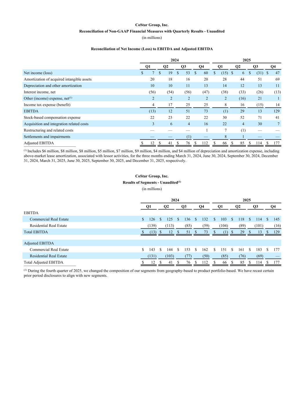 CoStar Group, Inc. Reconciliation of Non-GAAP Financial Measures with Quarterly Results - Unaudited (in millions) Reconciliation of Net Income (Loss) to EBITDA and Adjusted EBITDA 2024 2025 Q1 Q2 Q3 Q4 Q1 Q2 Q3 Q4 Net income (loss) $ 7 $ 19 $ 53 $ 60 $ (15) $ 6 $ (31) $ 47 Amortization of acquired intangible assets 20 18 16 20 28 44 51 69 Depreciation and other amortization 10 10 11 13 14 12 13 11 Interest income, net (56) (54) (56) (47) (38) (33) (26) (13) Other (income) expense, net(1) 2 2 2 2 2 (16) 21 1 Income tax expense (benefit) 4 17 25 25 8 16 (15) 14 EBITDA (13) 12 51 73 (1) 29 13 129 Stock-based compensation expense 22 23 22 22 30 52 71 41 Acquisition and integration related costs 3 6 4 16 22 4 30 7 Restructuring and related costs — — — 1 7 (1) — — Settlements and impairments — — (1) — 8 1 — — Adjusted EBITDA $ 12 $ 41 $ 76 $ 112 $ 66 $ 85 $ 114 $ 177 __________________________ (1) Includes $6 million, $8 million, $8 million, $5 million, $7 million, $9 million, $4 million, and $4 million of depreciation and amortization expense, including above-market lease amortization, associated with lessor activities, for the three months ending March 31, 2024, June 30, 2024, September 30, 2024, December 31, 2024, March 31, 2025, June 30, 2025, September 30, 2025, and December 31, 2025, respectively. CoStar Group, Inc. Results of Segments - Unaudited(1) (in millions) 2024 2025 Q1 Q2 Q3 Q4 Q1 Q2 Q3 Q4 EBITDA Commercial Real Estate $ 126 $ 125 $ 136 $ 132 $ 103 $ 118 $ 114 $ 145 Residential Real Estate (139) (113) (85) (59) (104) (89) (101) (16) Total EBITDA $ (13) $ 12 $ 51 $ 73 $ (1) $ 29 $ 13 $ 129 Adjusted EBITDA Commercial Real Estate $ 143 $ 144 $ 153 $ 162 $ 151 $ 161 $ 183 $ 177 Residential Real Estate (131) (103) (77) (50) (85) (76) (69) — Total Adjusted EBITDA $ 12 $ 41 $ 76 $ 112 $ 66 $ 85 $ 114 $ 177 __________________________ (1) During the fourth quarter of 2025, we changed the composition of our segments from geography-based to product portfolio-based. We have recast certain prior period disclosures to align with new segments.