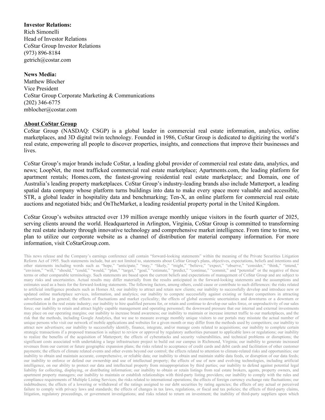 Investor Relations: Rich Simonelli Head of Investor Relations CoStar Group Investor Relations (973) 896-8184 getrich@costar.com News Media: Matthew Blocher Vice President CoStar Group Corporate Marketing & Communications (202) 346-6775 mblocher@costar.com About CoStar Group CoStar Group (NASDAQ: CSGP) is a global leader in commercial real estate information, analytics, online marketplaces, and 3D digital twin technology. Founded in 1986, CoStar Group is dedicated to digitizing the world’s real estate, empowering all people to discover properties, insights, and connections that improve their businesses and lives. CoStar Group’s major brands include CoStar, a leading global provider of commercial real estate data, analytics, and news; LoopNet, the most trafficked commercial real estate marketplace; Apartments.com, the leading platform for apartment rentals; Homes.com, the fastest-growing residential real estate marketplace; and Domain, one of Australia’s leading property marketplaces. CoStar Group’s industry-leading brands also include Matterport, a leading spatial data company whose platform turns buildings into data to make every space more valuable and accessible, STR, a global leader in hospitality data and benchmarking; Ten-X, an online platform for commercial real estate auctions and negotiated bids; and OnTheMarket, a leading residential property portal in the United Kingdom. CoStar Group’s websites attracted over 139 million average monthly unique visitors in the fourth quarter of 2025, serving clients around the world. Headquartered in Arlington, Virginia, CoStar Group is committed to transforming the real estate industry through innovative technology and comprehensive market intelligence. From time to time, we plan to utilize our corporate website as a channel of distribution for material company information. For more information, visit CoStarGroup.com. This news release and the Company’s earnings conference call contain “forward-looking statements” within the meaning of the Private Securities Litigation Reform Act of 1995. Such statements include, but are not limited to, statements about CoStar Group's plans, objectives, expectations, beliefs and intentions and other statements including words such as “hope,” “anticipate,” “may,” “likely,” “might,” “believe,” “expect,” “observe,” “consider,” “think,” “intend,” “envision,” “will,” “should,” “could,” “would,” “plan,” “target,” “goal,” “estimate,” “predict,” “continue,” “commit,” and “potential” or the negative of these terms or other comparable terminology. Such statements are based upon the current beliefs and expectations of management of CoStar Group and are subject to many risks and uncertainties. Actual results may differ materially from the results anticipated in the forward-looking statements and the assumptions and estimates used as a basis for the forward-looking statements. The following factors, among others, could cause or contribute to such differences: the risks related to artificial intelligence products such as Homes AI; our inability to attract and retain new clients; our inability to successfully develop and introduce new or updated online marketplace services, information, and analytics; our inability to compete successfully against existing or future competitors in attracting advertisers and in general; the effects of fluctuations and market cyclicality; the effects of global economic uncertainties and downturns or a downturn or consolidation in the real estate industry; our inability to hire qualified persons for, or retain and continue to develop our sales force, or unproductivity of our sales force; our inability to retain and attract highly capable management and operating personnel; the downward pressure that our internal and external investments may place on our operating margins; our inability to increase brand awareness; our inability to maintain or increase internet traffic to our marketplaces, and the risk that the methods, including Google Analytics, that we use to measure average monthly unique visitors to our portals may misstate the actual number of unique persons who visit our network of mobile applications and websites for a given month or may differ from the methods used by competitors; our inability to attract new advertisers; our inability to successfully identify, finance, integrate, and/or manage costs related to acquisitions; our inability to complete certain strategic transactions if a proposed transaction is subject to review or approval by regulatory authorities pursuant to applicable laws or regulations; our inability to realize the benefits of the acquisition of Matterport; the effects of cyberattacks and security vulnerabilities, and technical problems or disruptions; the significant costs associated with undertaking a large infrastructure project to build out our campus in Richmond, Virginia; our inability to generate increased revenues from our current or future geographic expansion plans; the risks related to acceptance of credit cards and debit cards and facilitation of other customer payments; the effects of climate related events and other events beyond our control; the effects related to attention to climate-related risks and opportunities; our inability to obtain and maintain accurate, comprehensive, or reliable data; our inability to obtain and maintain stable data feeds, or disruption of our data feeds; our inability to enforce or defend our ownership and use of intellectual property; the effects of use of new and evolving technologies, including artificial intelligence, on our ability to protect our data and intellectual property from misappropriation by third parties; our inability to defend against potential legal liability for collecting, displaying, or distributing information; our inability to obtain or retain listings from real estate brokers, agents, prope